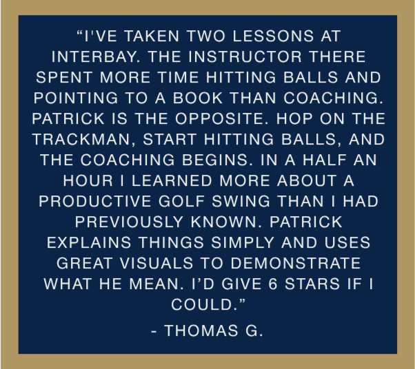 There key areas Patrick helps you develop and improve are setup, finish, swing path, attack angle, short game, and course management. He explains the cause/effect of your swing to help you understand the mechanics behind the setup and swing changes. Patrick proudly uses Trackman - the #1 Launch Monitor on the PGA Tour.