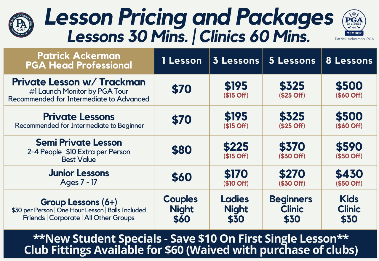Private lessons are the ideal way to learn the game and reach your goals for any golfer. He will create confidence through a repeatable swing and setup, which will lead to lower scores. You will see steady improvement and gain understanding. Patrick has experience working with all skill levels and ages.